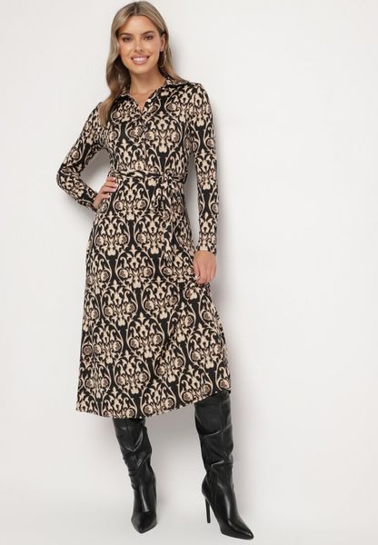 Czarno-Beżowa Sukienka Koszulowa Ozdobiona Ornamentalnym Wzorem Mesilie