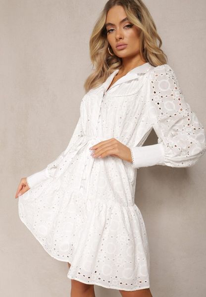 Biała Bawełniana Sukienka Rozkloszowana z Paskiem w Talii i Ażurowymi Rękawami Lurionna