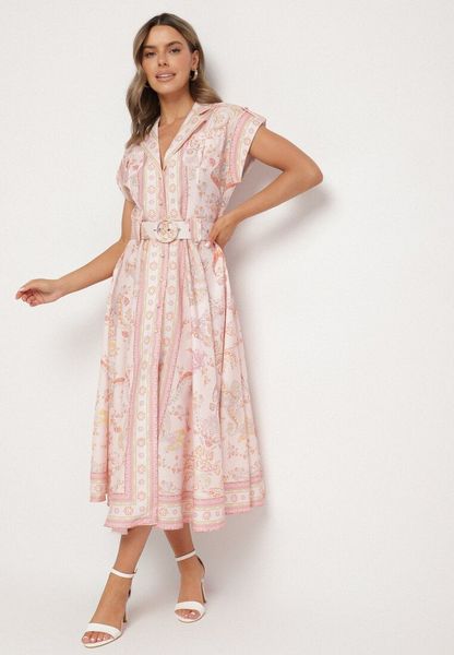 Różowa Rozkloszowana Sukienka Koszulowa z Wiązanym Paskiem i Krótkim Rękawem Lavialane