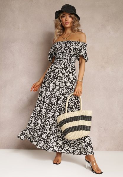 Czarna Trapezowa Sukienka Bawełniana w Kwiaty Cresenia