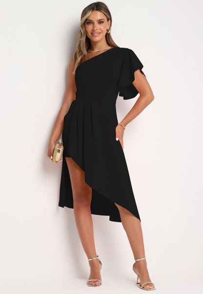Czarna Asymetryczna Sukienka Wieczorowa na Jedno Ramię Ozdobiona Falbankami Vimasira