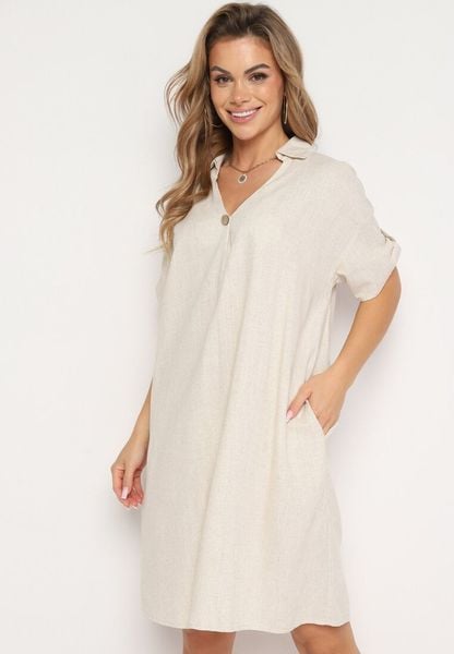 Beżowa Sukienka Szmizjerka z Guzikami przy Dekolcie z Podwijanymi Rękawami Ketella