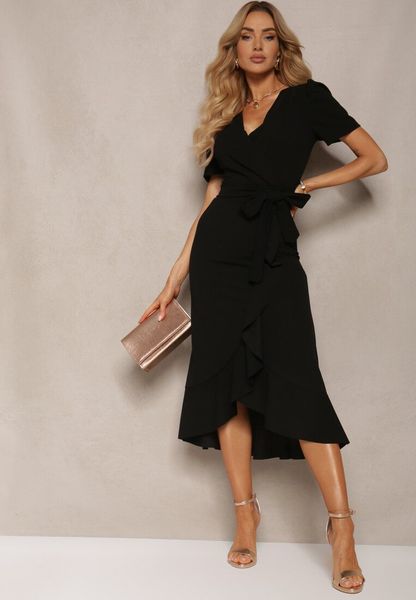 Czarna Kopertowa Sukienka z Falbanką Caronia
