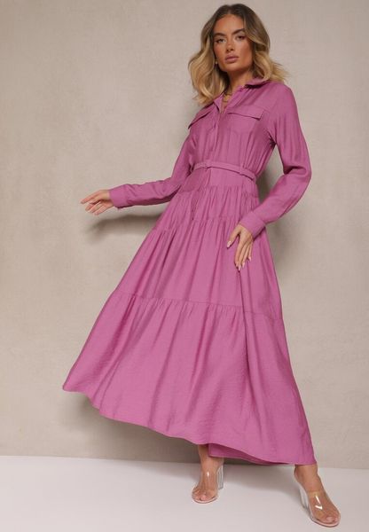 Fioletowa Rozkloszowana Sukienka z Wiskozy z Guzikami i Paskiem Ronesa