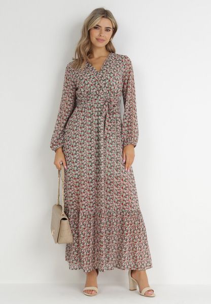 Zielono-Czerwona Sukienka Kopertowa z Falbanką i Wiązanym Paskiem Luftare