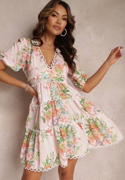 Jasnoróżowa Kwiecista Sukienka Mini z Koronkowymi Wstawkami i Krótkim Rękawem Palosun