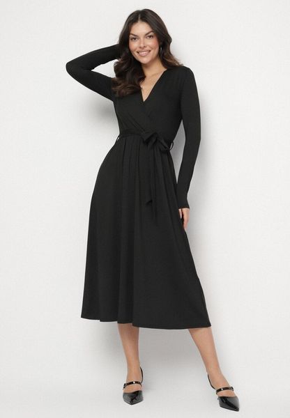 Czarna Sukienka Kopertowa z Wiskozą Wiązana w Talii Drestalia
