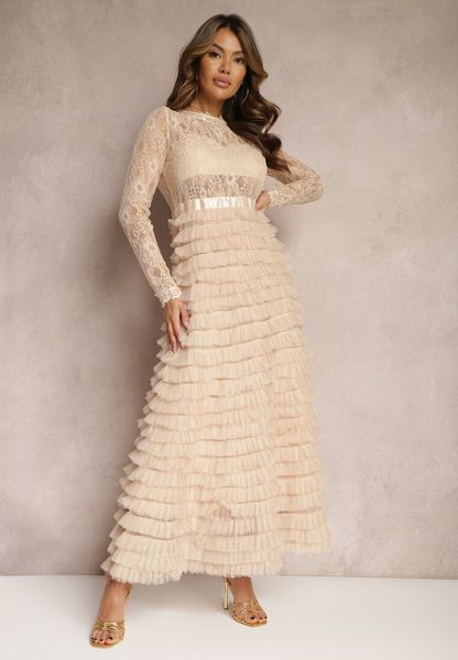Jasnobeżowa Maxi Sukienka Rozkloszowana z Koronkową Górą i Tiulowymi Falbankami Firina