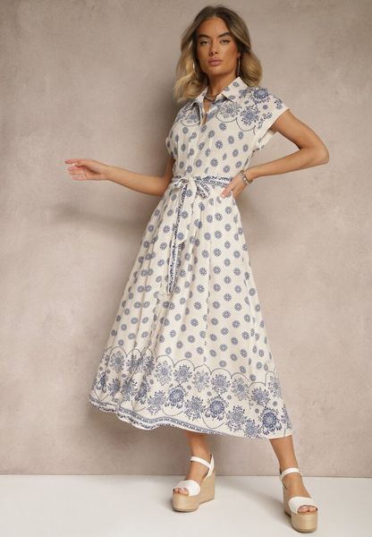 Beżowo-Niebieska Wiskozowa Sukienka w Kwiaty o Koszulowym Kroju z Wiązanym Paskiem Iffiana