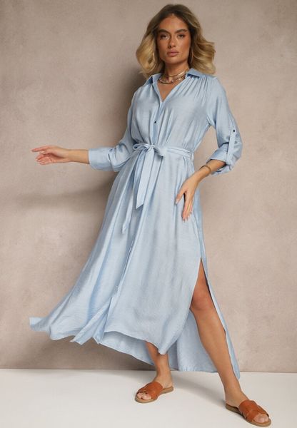 Niebieska Sukienka Koszulowa z Wiskozą Ozdobiona Paskiem Cleonira