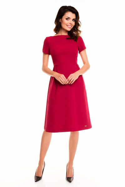 Bordowa Sukienka Rozkloszowana Midi z Krótkim Rękawem