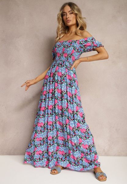 Fioletowo-Niebieska Hiszpanka Sukienka o Rozkloszowanym Kroju i Gumkami przy Dekolcie Kaseria