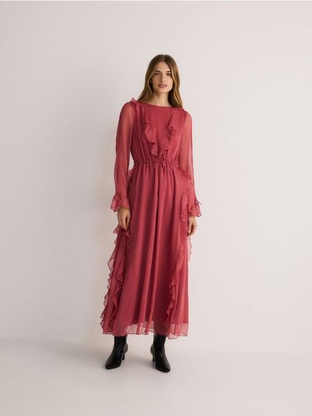 Sukienka maxi z falbanami – brudny róż