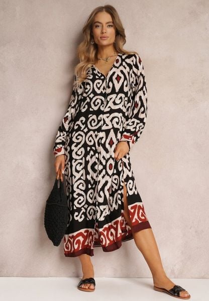 Beżowo-Czarna Sukienka w Print Boho z Wiskozy Rozkloszowana z Dekoltem V Palarina