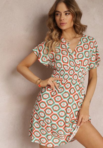 Pomarańczowa Sukienka Mini z Wiskozy z Gumką w Pasie i Kopertowym Dekoltem Karisa