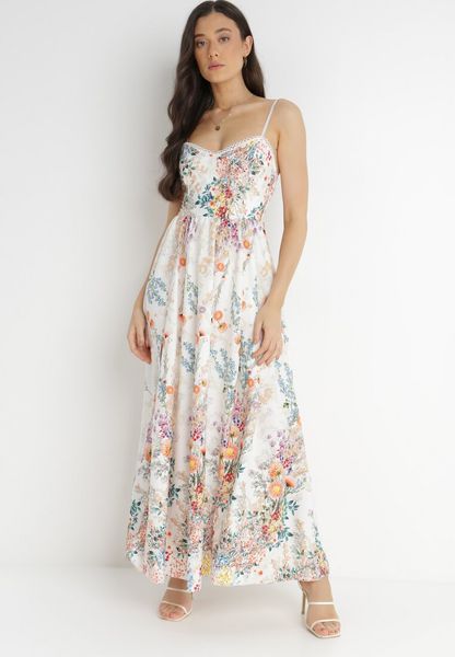Sukienka Megeusa o zwiewnej i rozkloszowanej długości maxi. Zachwyca niezwykle kobiecym printem w drobne, wielokolorowe kwiaty. Na cienkich, regulowanych ramiączkach. Na dole po bokach wycięcia. Bez podszewki. Z tyłu wszyte elastyczne gumki, które tworzą dopasowany krój. Fenomenalnie podkreśli Twoją kobiecość. Możesz ją nosić w towarzystwie płaskich sandałków lub na koturnie!