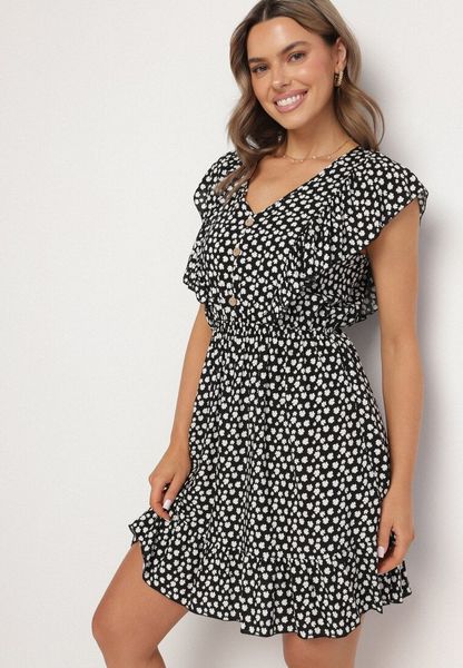 Czarna Rozkloszowana Sukienka z Bawełny w Kwiaty z Guzikami Ronelle