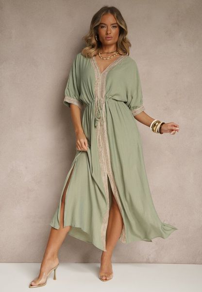 Zielona Sukienka z Wiskozy Ozdobiona Ażurowymi Wstawkami Aloviana