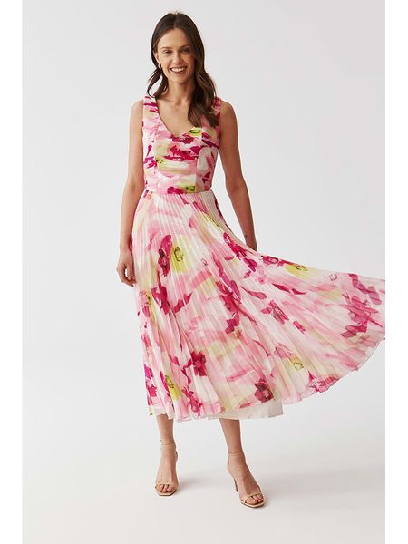 – zapięcie: suwak na plecach- dekolt: V- ramiączka: szerokie- krój: rozkloszowany- detale: plisy- wzór: na całości