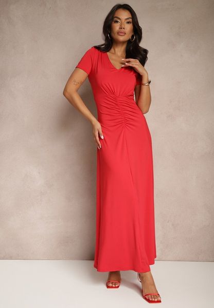 Czerwona Taliowana Sukienka z Ozdobnymi Marszczeniami i Domieszką Wiskozy Avenile