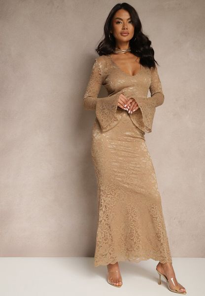 Beżowa Dopasowana Sukienka Zdobiona Koronką z Rozszerzanym Dołem Hannalis