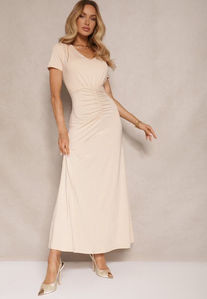 Jasnobeżowa Taliowana Sukienka z Ozdobnymi Marszczeniami i Domieszką Wiskozy Avenile