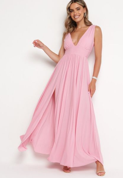 Różowa Koktajlowa Sukienka na Ramiączkach z Trójkątnym Dekoltem i Rozcięciem z Boku Nestarli