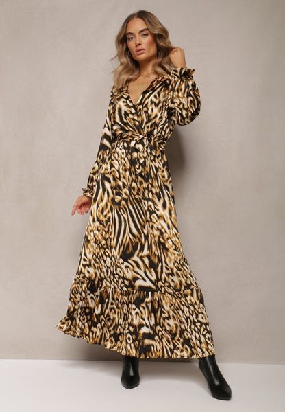 Brązowa Panterkowa Sukienka z Kopertowym Dekoltem Koronką Paskiem i Gumką w Talii Siavindra