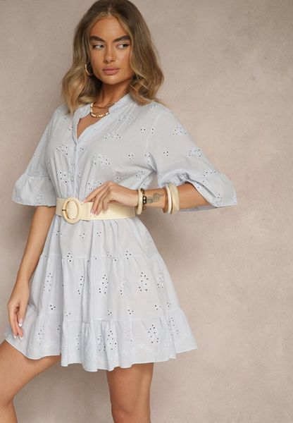 Jasnoniebieska Rozkloszowana Sukienka Koszulowa z Bawełny Zdobiona Haftem i Falbanami Filarosa