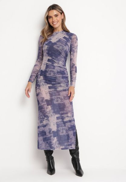 Granatowa Dopasowana Sukienka Maxi w Fantazyjny Print Sartine