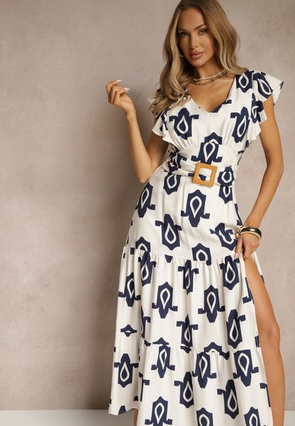 Biało-Granatowa Sukienka z Wiskozy Ozdobiona Paskiem z Klamrą i Geometrycznym Wzorem Orivana
