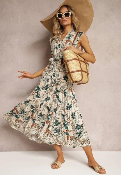 Beżowo-Zielona Sukienka z Wiskozy Zapinana na Guziki z Gumką w Pasie i Materiałowym Paskiem Zefalia