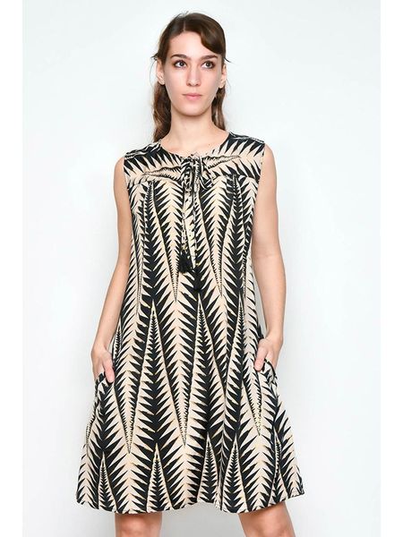 – ramiączka: szerokie- dekolt: łódka- zapięcie: wiązane tasiemki- krój: litera A- wzór: graficzny