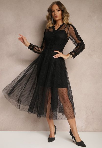 Czarna Rozkloszowana Sukienka Midi z Tiulu z Koronką Rislaine