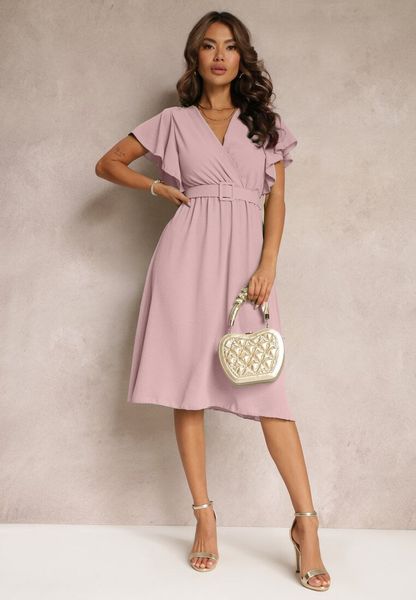 Jasnoróżowa Rozkloszowana Sukienka z Paskiem i Kopertowym Dekoltem Brinea