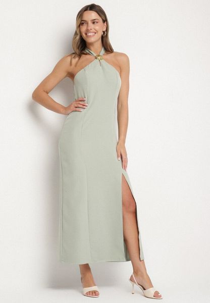 Jasnozielona Sukienka z Wiskozą z Odkrytymi Plecami i Wiązaniem Zdobiona Broszką Nalorise