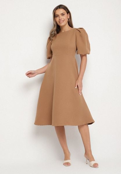 Jasnobrązowa Sukienka o Rozkloszowanym Kroju z Bufiastymi Rękawami Melisseia