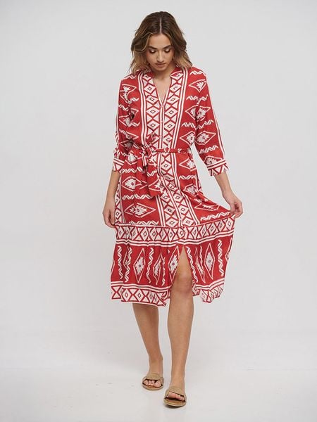 – czysta wiskoza- dekolt: V- zapięcie: listwa guzikowa- długość rękawa: 3/4- zdejmowany pasek: tkanina- krój: rozkloszowany- wzór: na całości