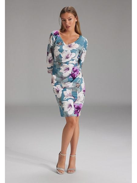– dekolt: V- zapięcie: suwak na plecach- długość rękawa: 3/4- krój: taliowany- wzór: kwiatowy