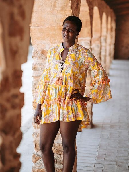 – czysta bawełna- kołnierz: stójka- dekolt: V- krój rękawów: rozszerzany do dołu – dolny brzeg: z falbankami- detale: ozdobne wiązanie- krój: prosty- wzór: na całości