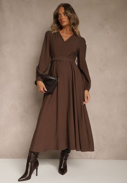 Brązowa Rozkloszowana Sukienka z Wiskozy z Paskiem ze Sprzączką Orille