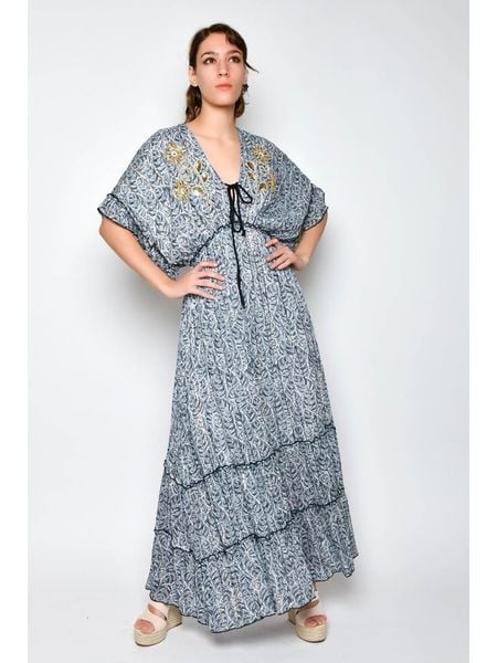 – czysta wiskoza- dekolt: V- zapięcie: wiązanie na plecach- krój rękawów: nietoperz- długość rękawa: 3/4- dolny brzeg: z falbankami- detale: haft, ozdobne wiązanie- krój: luźny- wzór: na całości