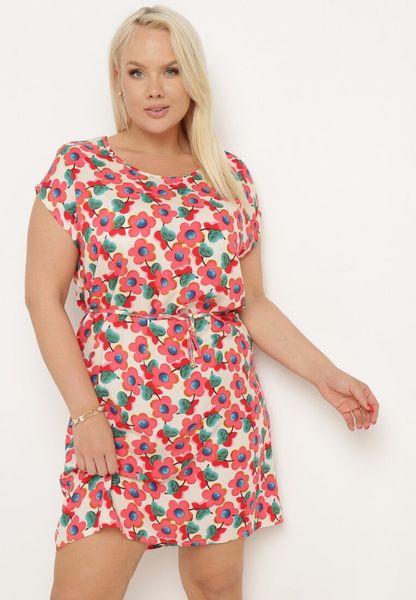 Beżowo-Czerwona Pudełkowa Sukienka z Wiskozy Wiązana Sznurkiem w Talii Tiamadine
