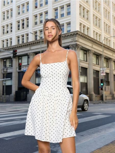 Biała Sukienka Vices w Grochy o Rozkloszowanym Kroju z Wiązaniem na Ramiączkach Saririse