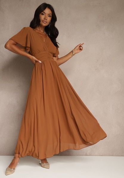 Brązowa Rozkloszowana Sukienka z Kopertowym Dekoltem Obillis