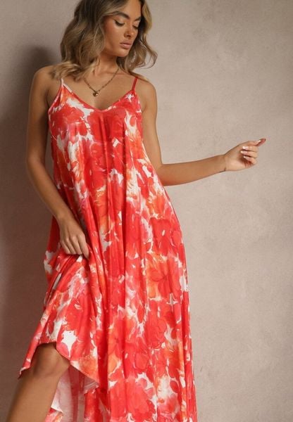 Czerwona Wiskozowa Sukienka Ozdobiona Abstrakcyjnym Motywem Nillosea