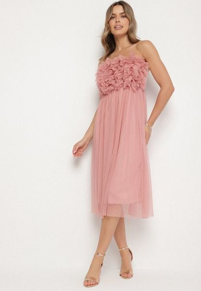 Zrób furorę z niezwykle kobiecą i delikatną Sukienką Larithia! Bez ramiączek, pod biustem wszyta gumka. Przy dekolcie ozdobne falbanki. Posiada elastyczną podszewkę.