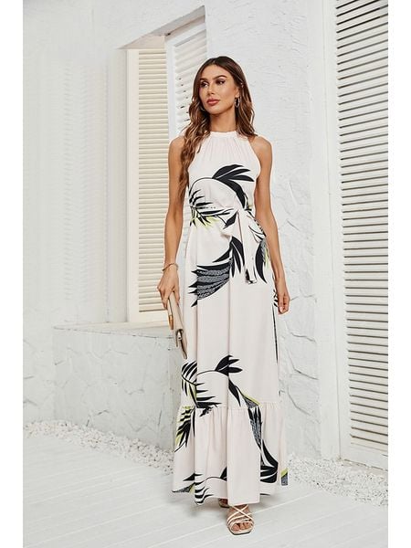 – ramiączka: na szyję- dekolt: okrągły- zapięcie: wiązanie na plecach- zdejmowany pasek: tkanina- dolny brzeg: z falbankami- krój: litera A- wzór: na całości