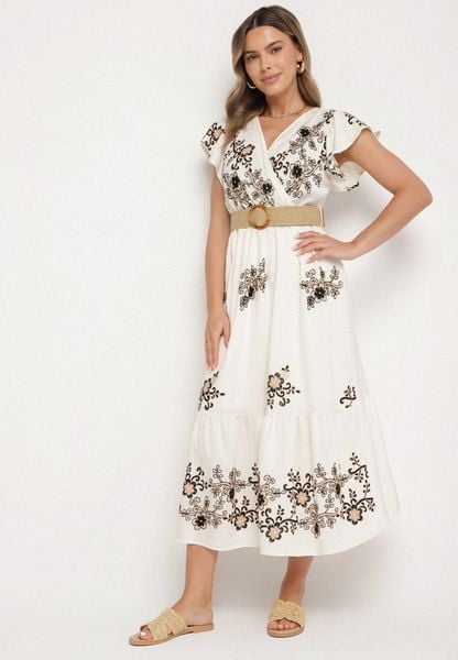 Biała Wiskozowa Sukienka z Kopertowym Dekoltem i Haftem z Metaliczną Nicią Emhiris
