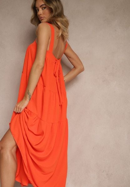 Pomarańczowa Wiskozowa Sukienka o Rozkloszowanym Kroju z Wiązaniem na Plecach Canella